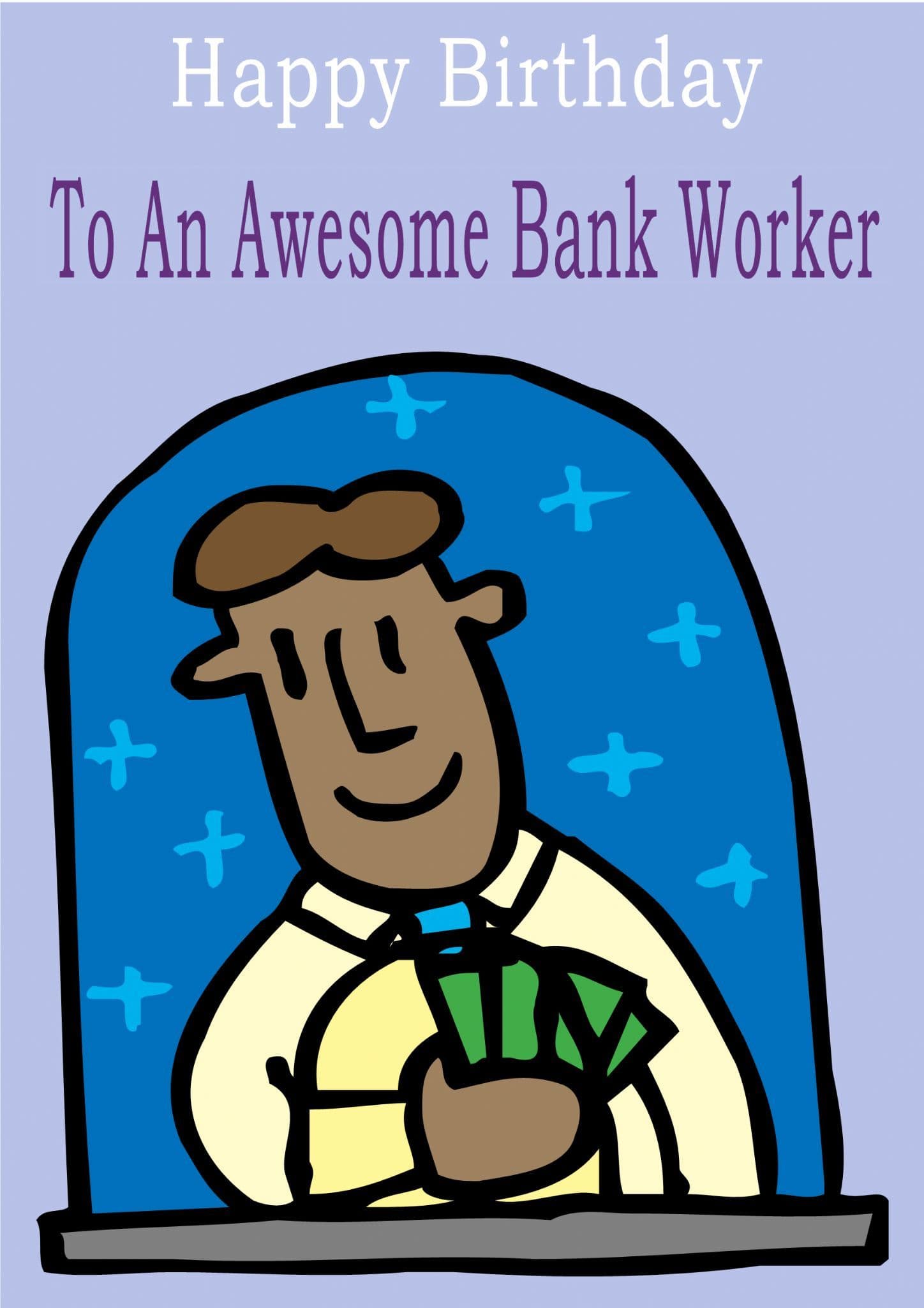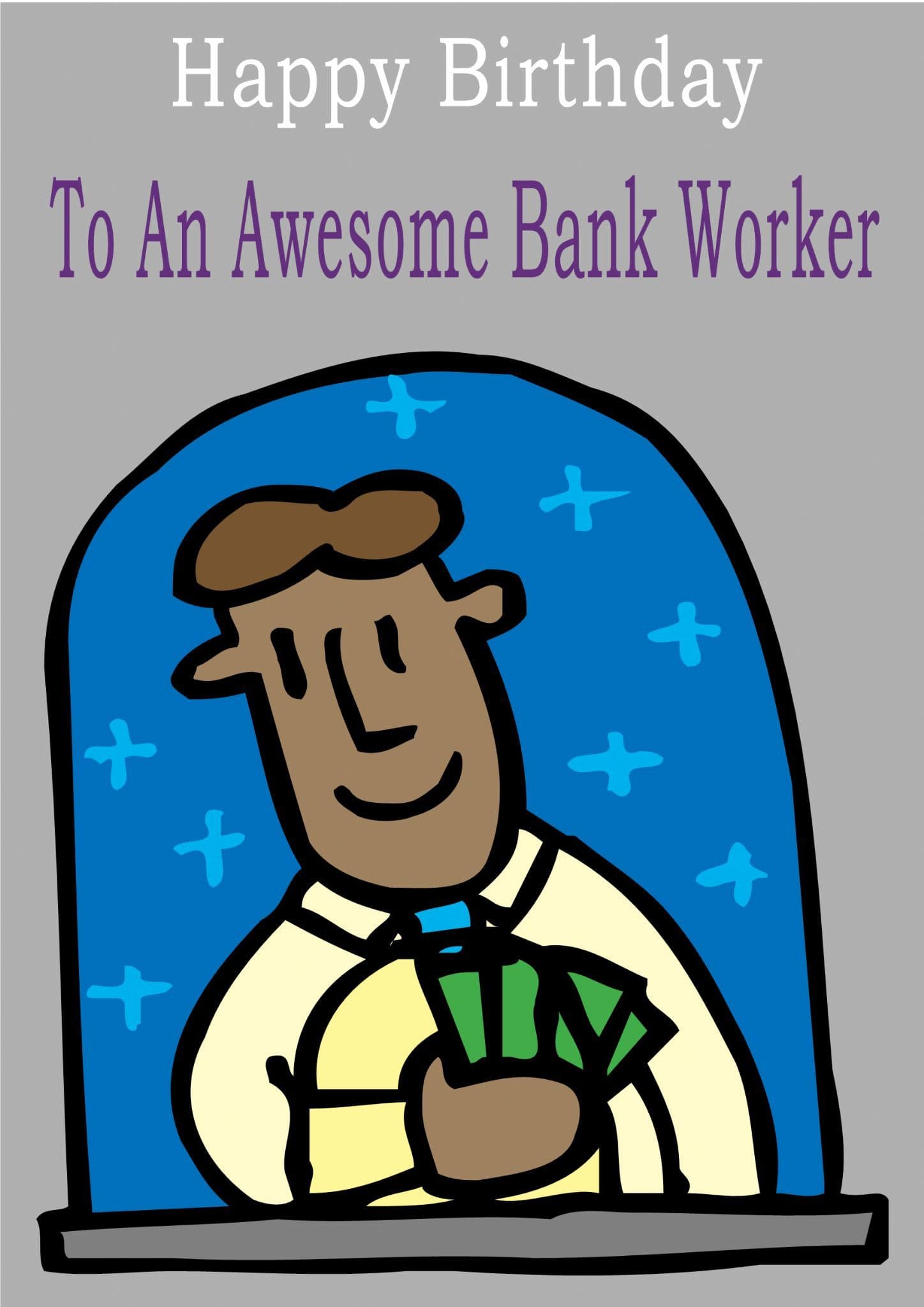 This "Occupation" birthday card has the text "Happy Birthday" "To An Awesome Bank Worker" on the front of the card and the message on the inside of the card says "Happy Birthday".