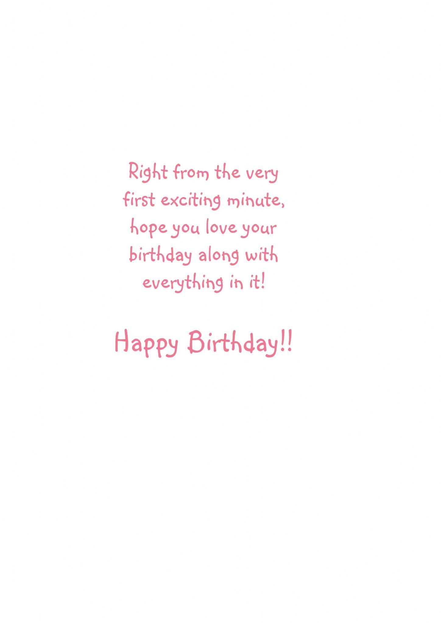 The message on the front of the card says "Happy Birthday!" and the inside of the card says "Right from the very first exciting minute, hope you love your birthday along with everything in it!" "Happy Birthday!!"