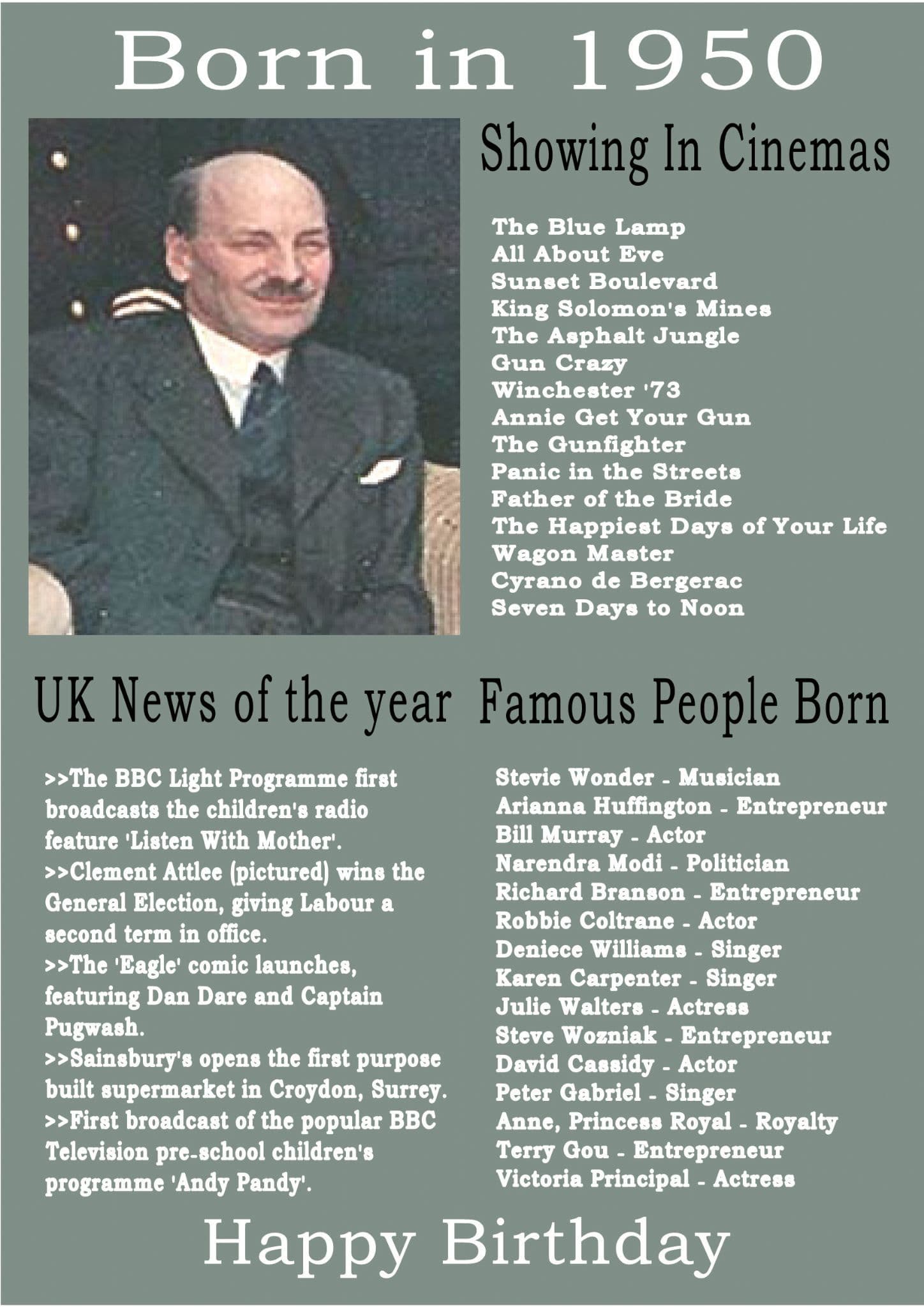 This Born In The Year 1950 card gives the recipient the UK news of the year, what was showing in cinemas that year and a list of famous people born in the year.