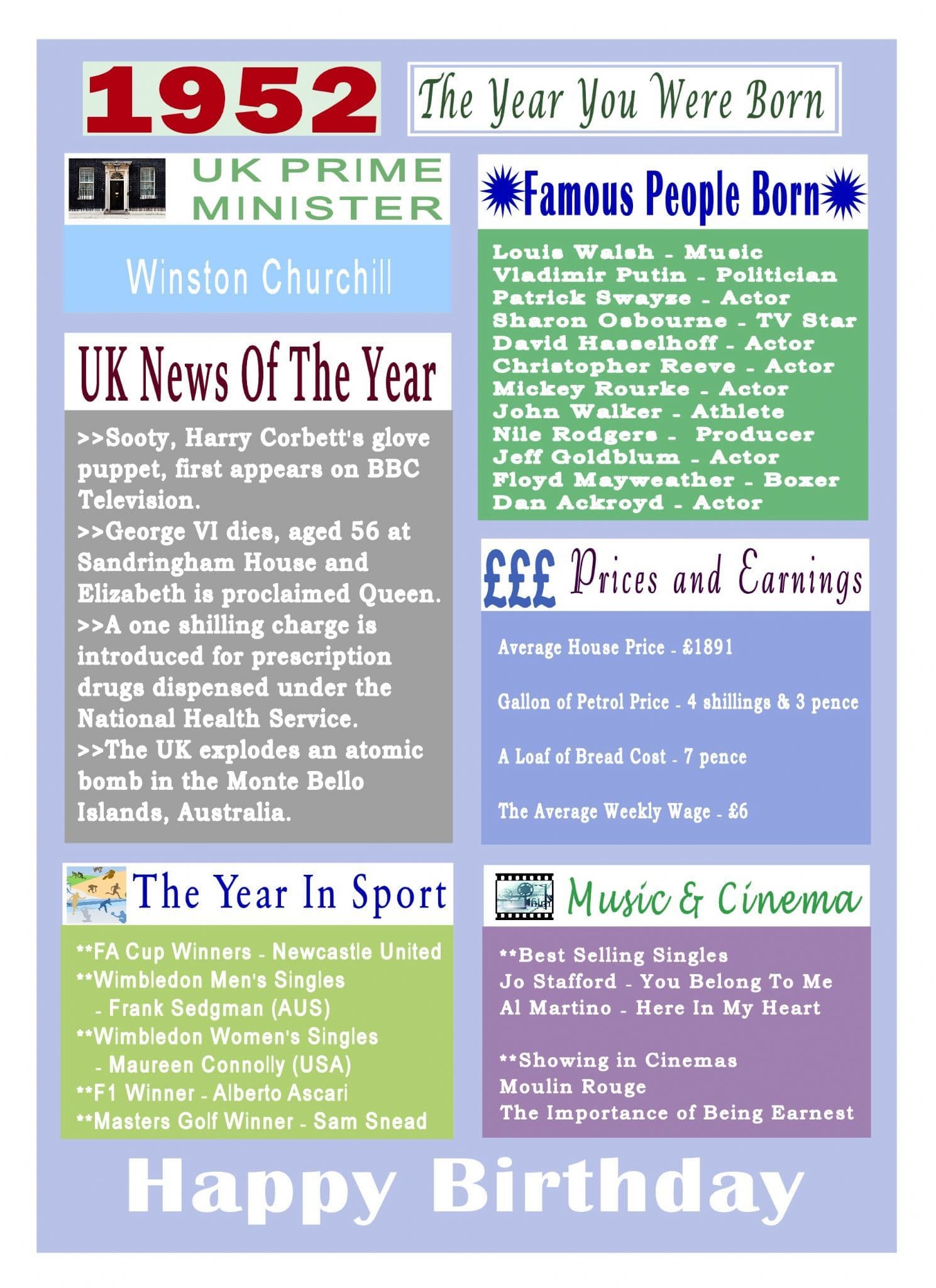 This Born In The Year 1952 card gives the recipient numerous facts about the year they were born. It shows the UK news of the year, showing in cinemas, hit singles, the Prime Minister, sporting events, prices and earnings and a list of famous people born in the year.