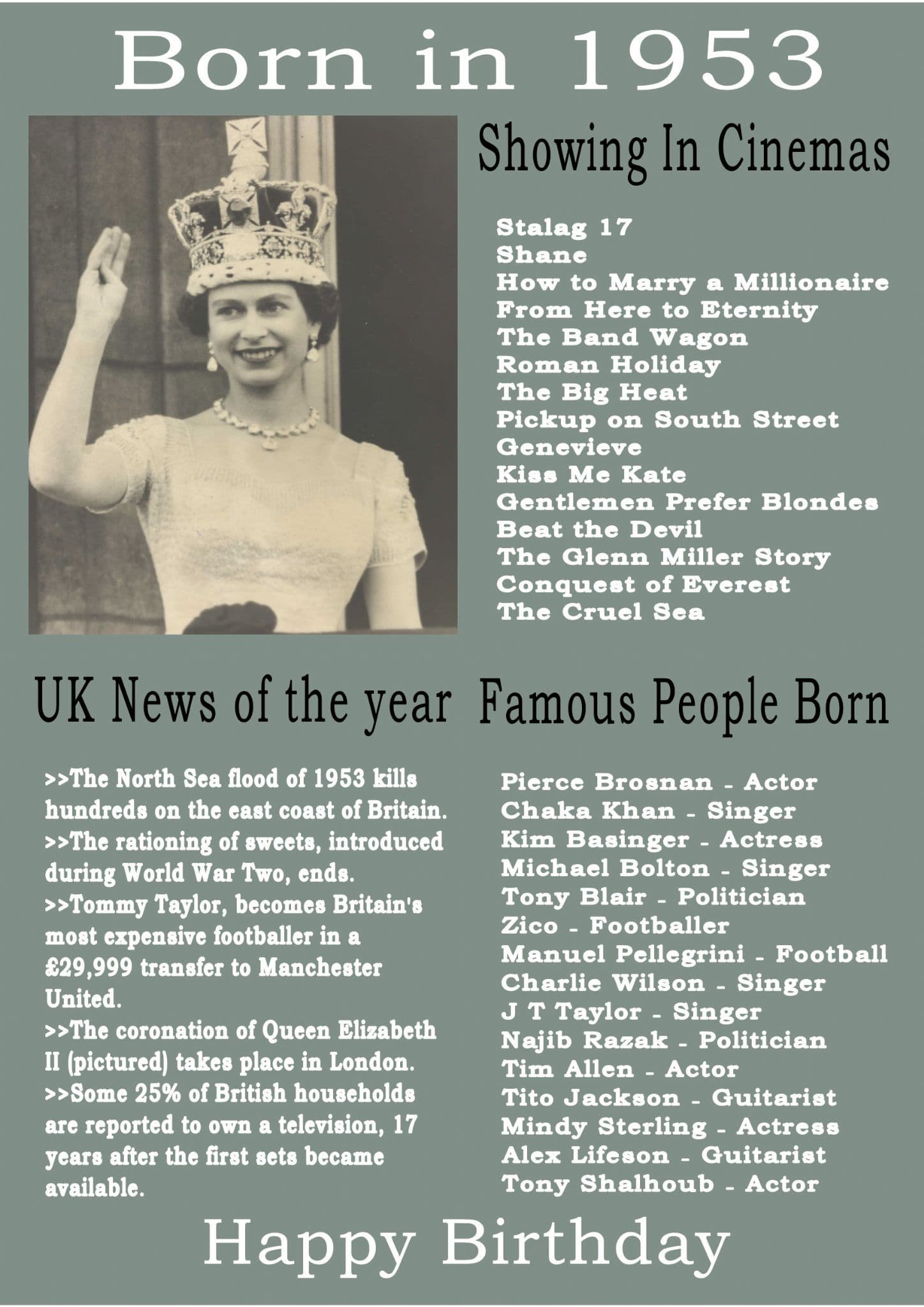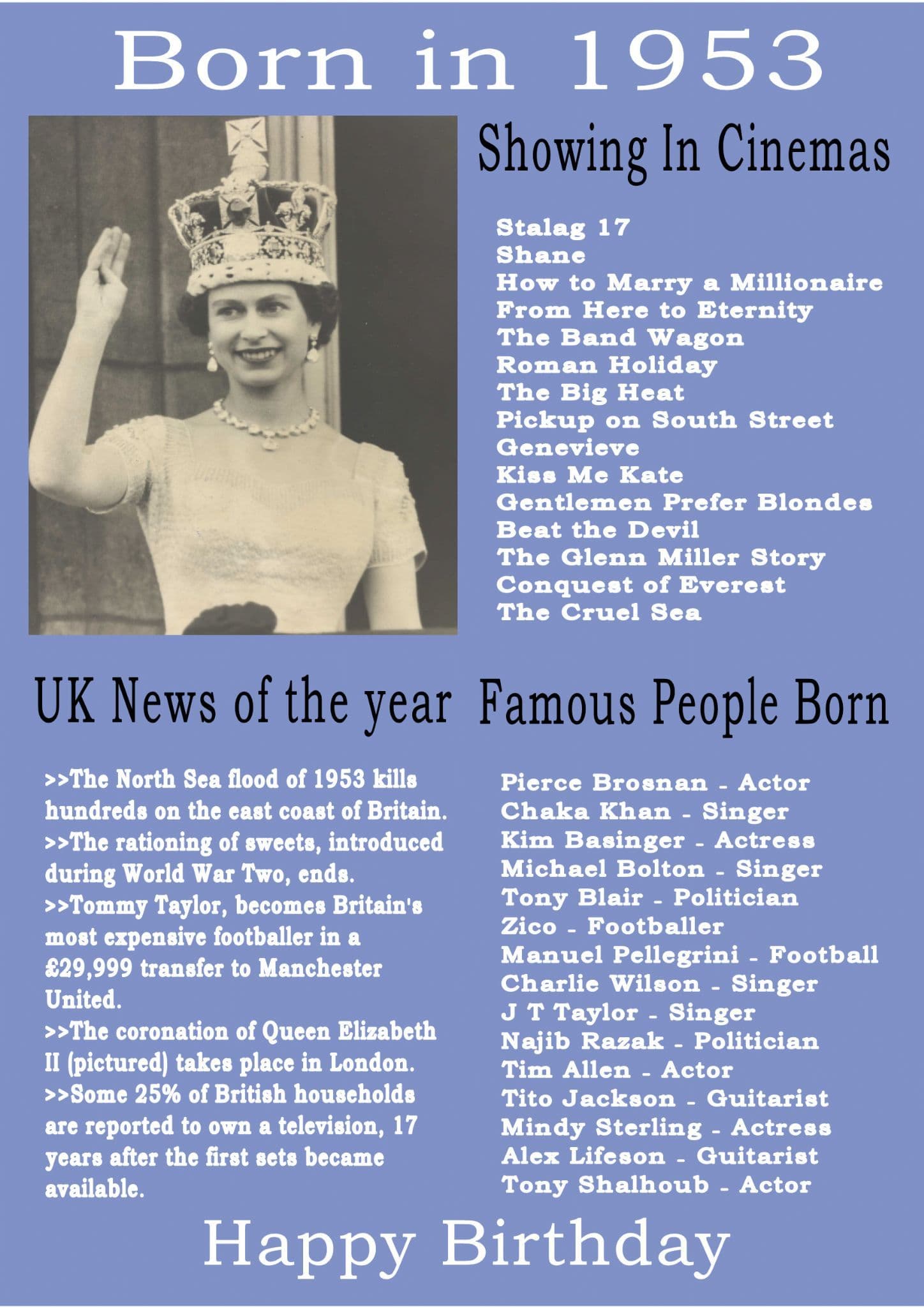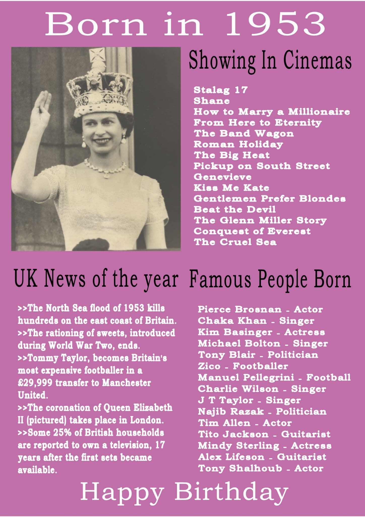 This Born In The Year 1953 card gives the recipient the UK news of the year, what was showing in cinemas that year and a list of famous people born in the year.