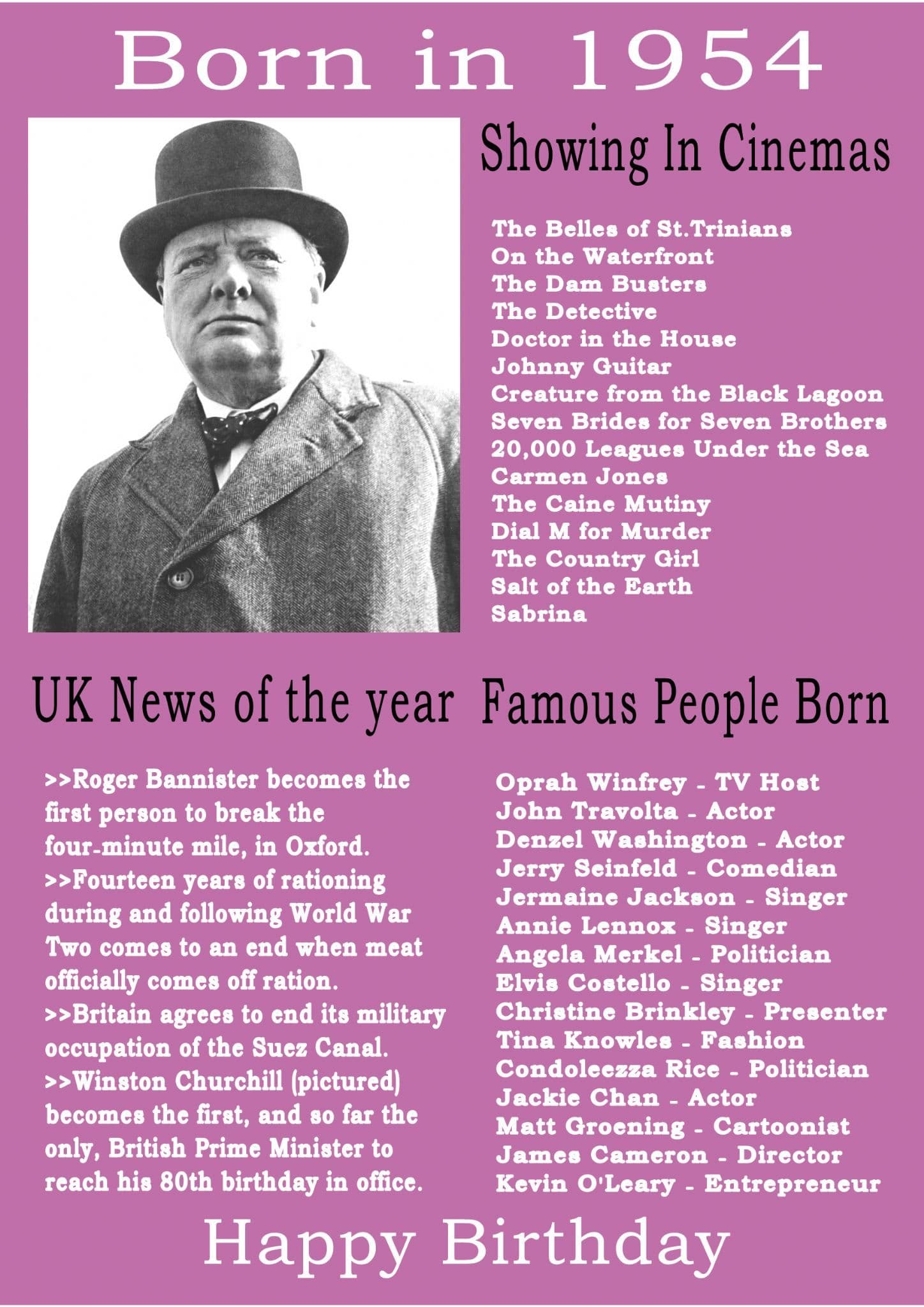 This Born In The Year 1954 card gives the recipient the UK news of the year, what was showing in cinemas that year and a list of famous people born in the year.