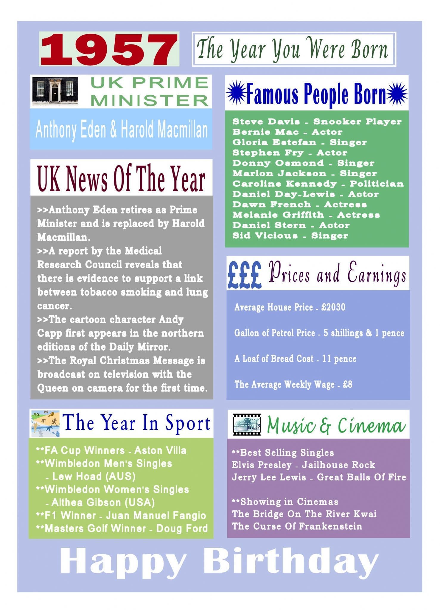 This Born In The Year 1957 card gives the recipient numerous facts about the year they were born. It shows the UK news of the year, showing in cinemas, hit singles, the Prime Minister, sporting events, prices and earnings and a list of famous people born in the year.