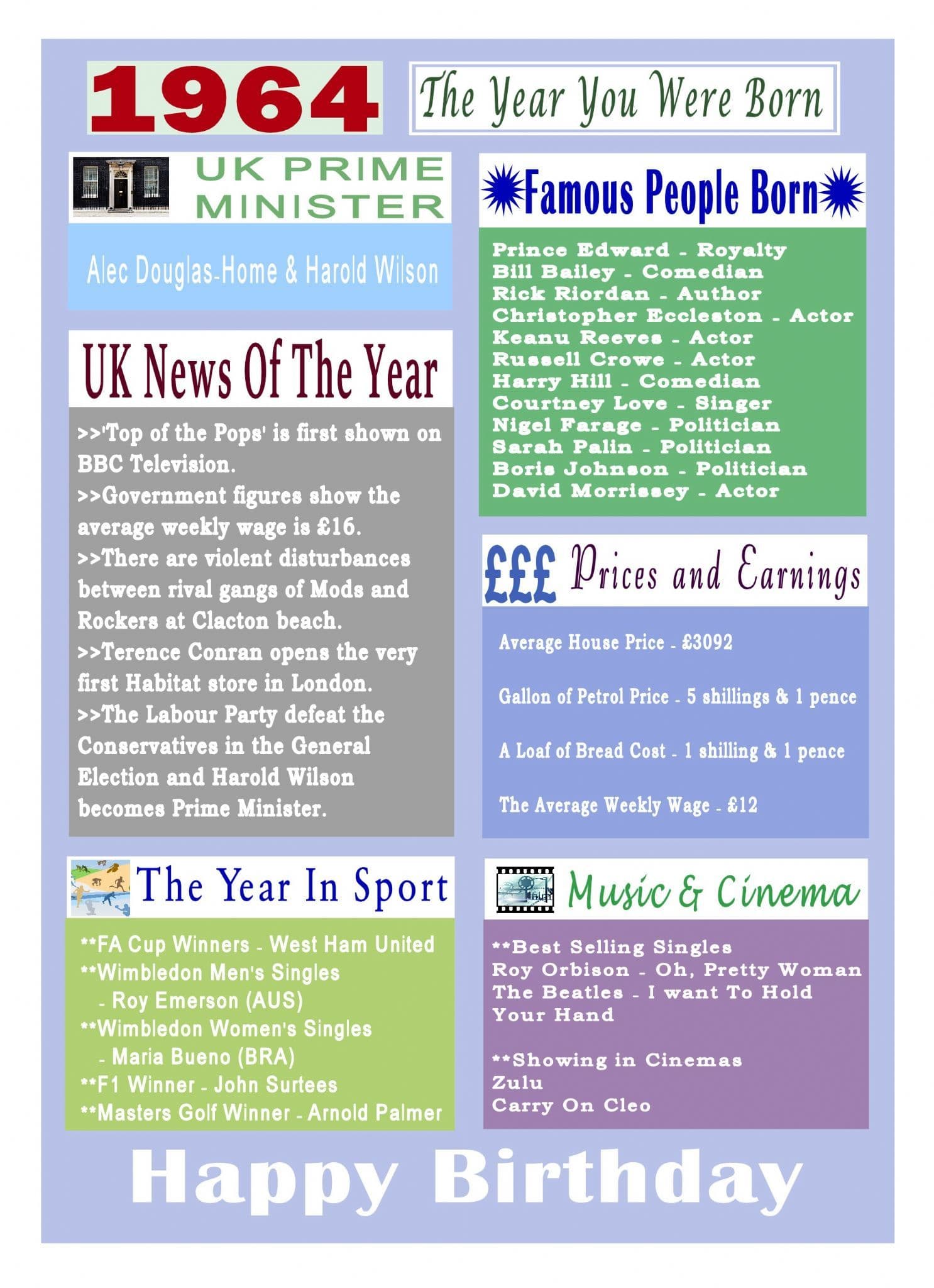 This Born In The Year 1964 card gives the recipient numerous facts about the year they were born. It shows the UK news of the year, showing in cinemas, hit singles, the Prime Minister, sporting events, prices and earnings and a list of famous people born in the year.