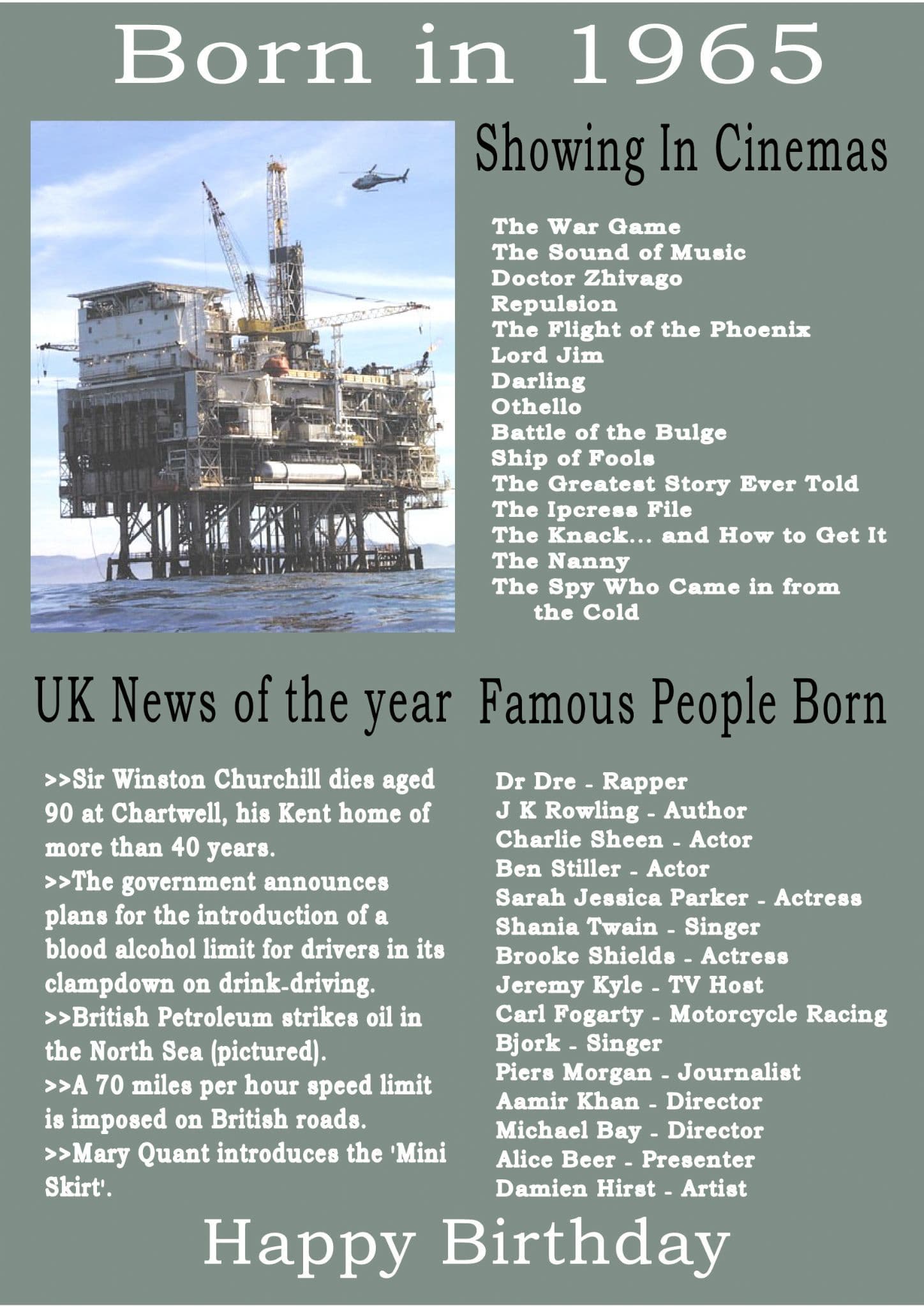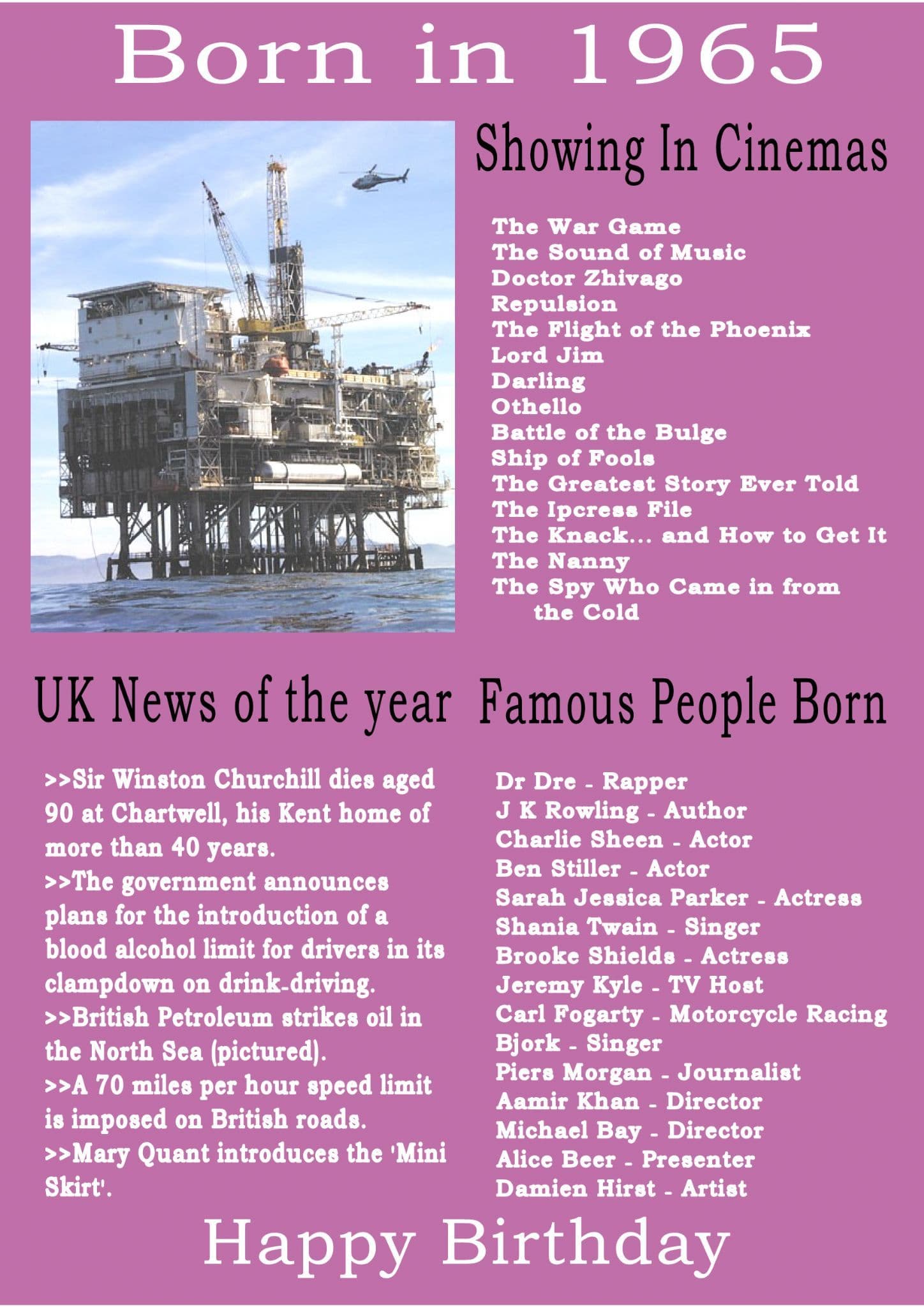 This Born In The Year 1965 card gives the recipient the UK news of the year, what was showing in cinemas that year and a list of famous people born in the year.
