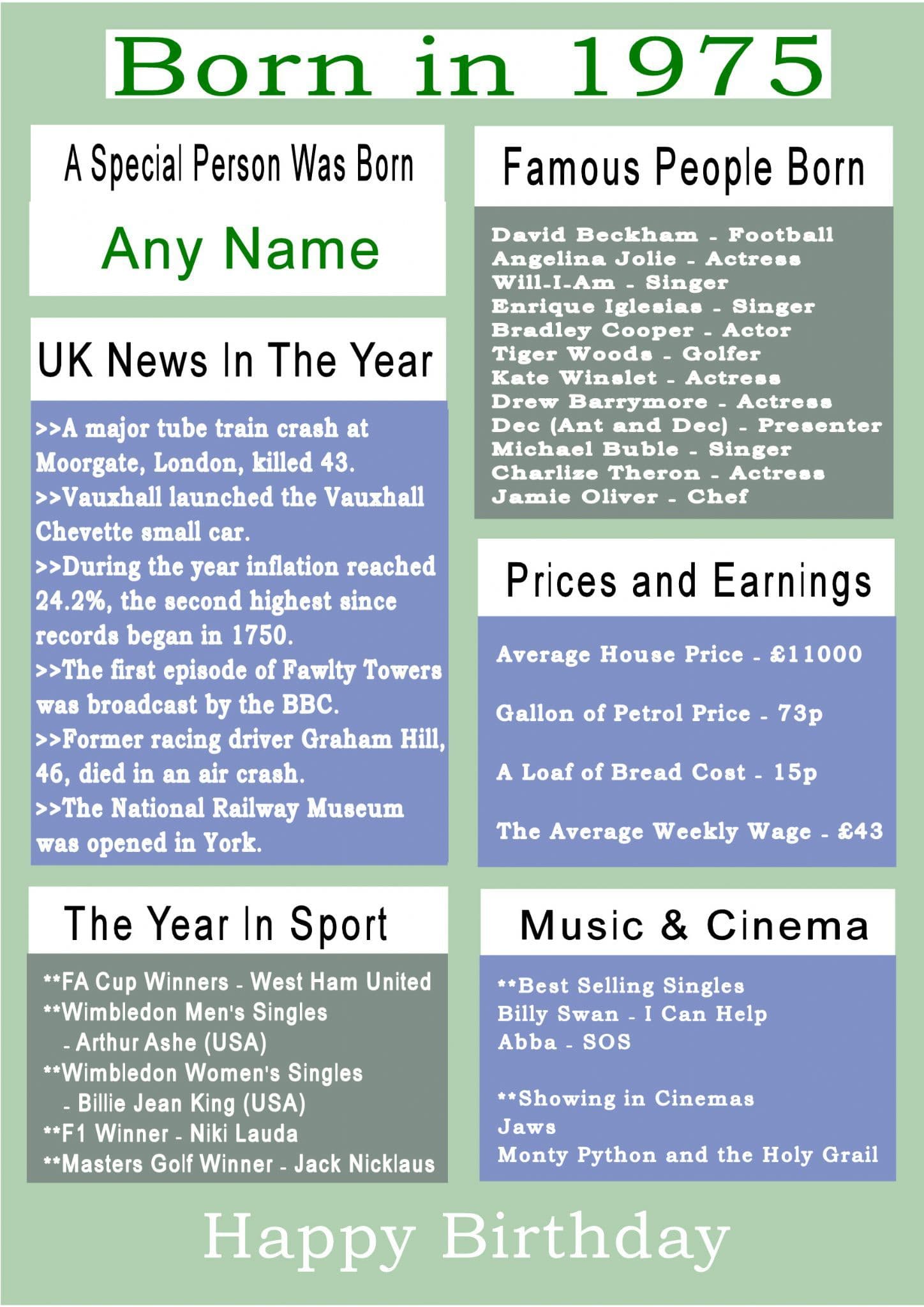 This Born In The Year 1975 card gives the recipient numerous facts about the year they were born. It shows the UK news of the year, showing in cinemas, hit singles, the Prime Minister, sporting events, prices and earnings and a list of famous people born in the year.
