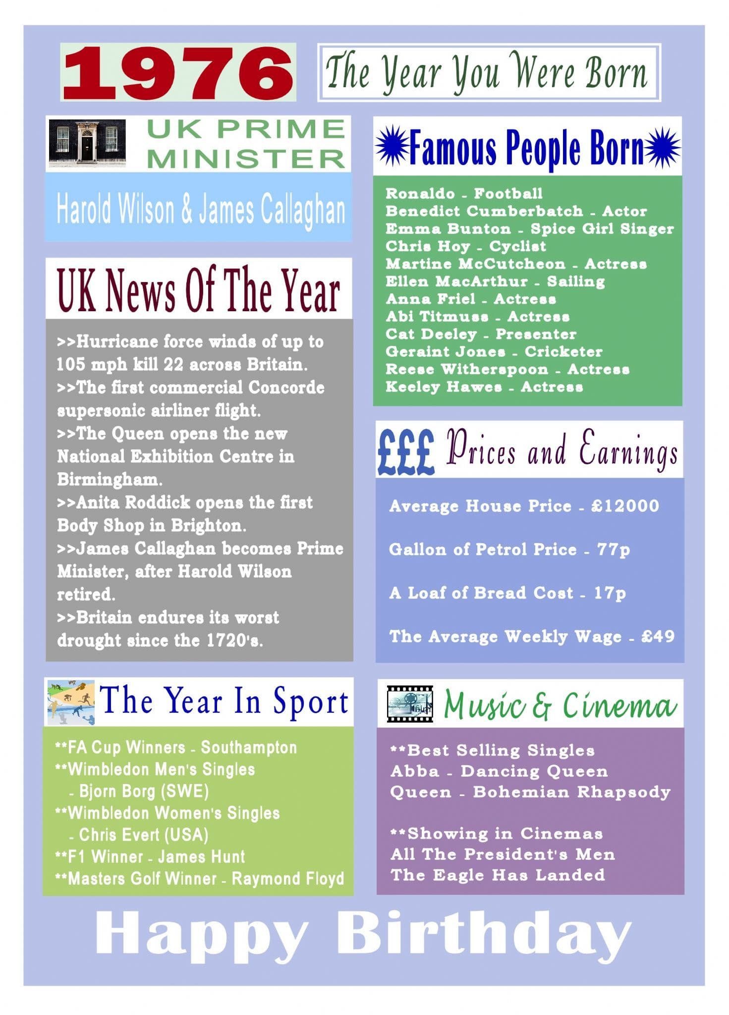 This Born In The Year 1976 card gives the recipient numerous facts about the year they were born. It shows the UK news of the year, showing in cinemas, hit singles, the Prime Minister, sporting events, prices and earnings and a list of famous people born in the year.