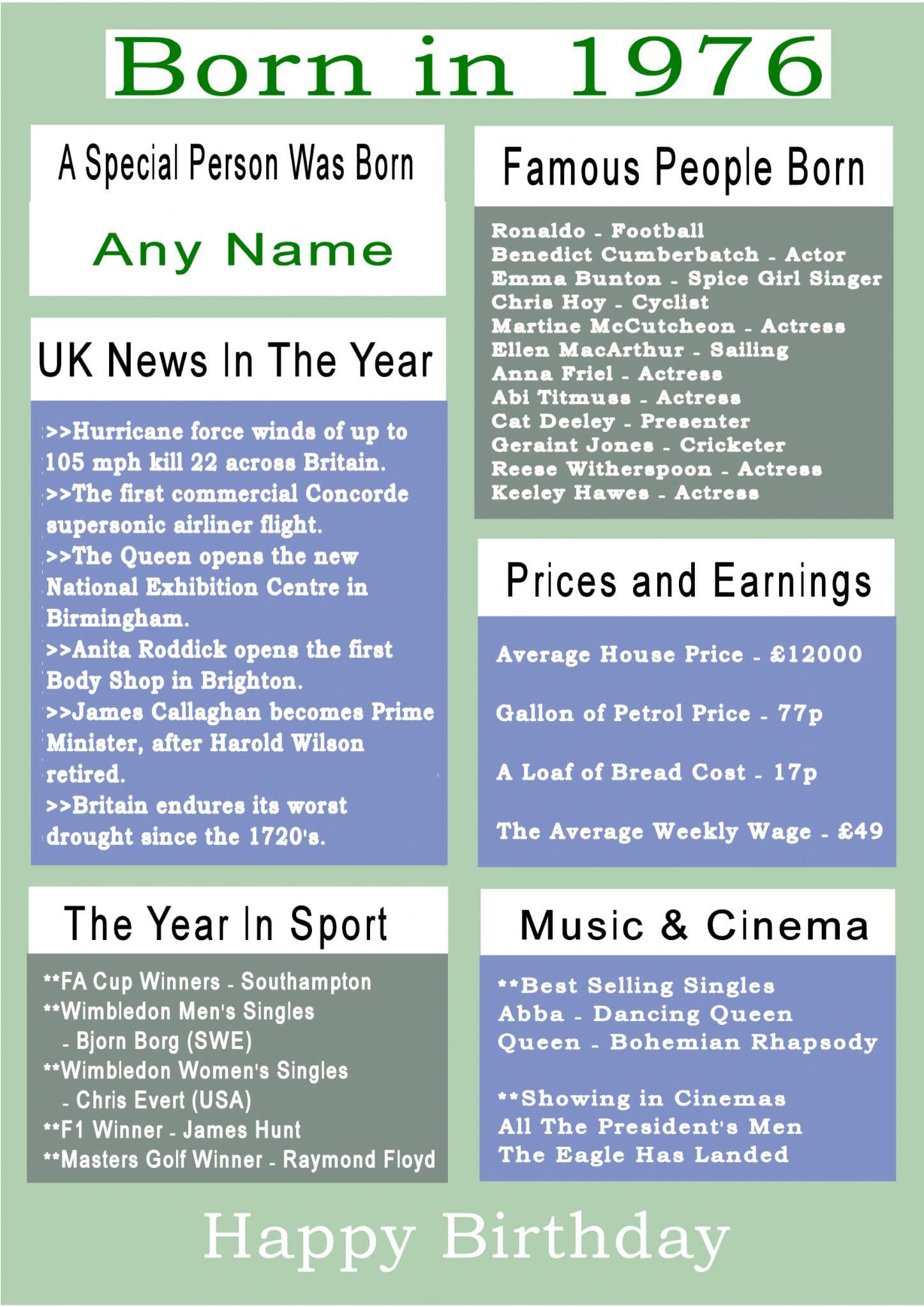 This Born In The Year 1976 card gives the recipient numerous facts about the year they were born. It shows the UK news of the year, showing in cinemas, hit singles, the Prime Minister, sporting events, prices and earnings and a list of famous people born in the year.