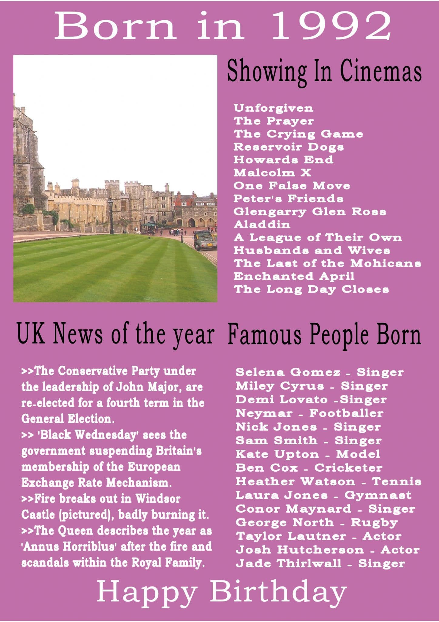 This Born In The Year 1992 card gives the recipient the UK news of the year, what was showing in cinemas that year and a list of famous people born in the year.