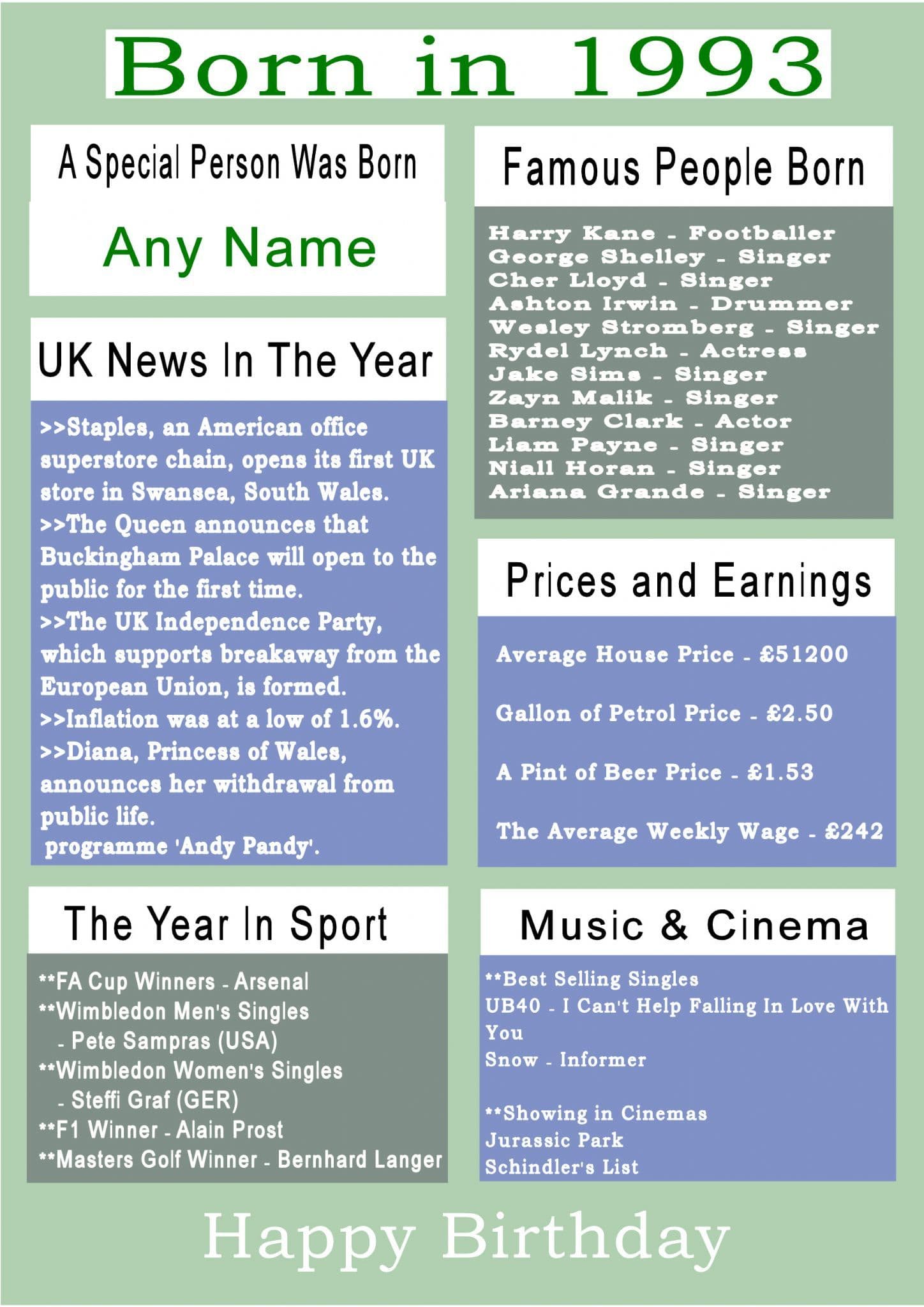 This Born In The Year 1993 card gives the recipient numerous facts about the year they were born. It shows the UK news of the year, showing in cinemas, hit singles, the Prime Minister, sporting events, prices and earnings and a list of famous people born in the year.