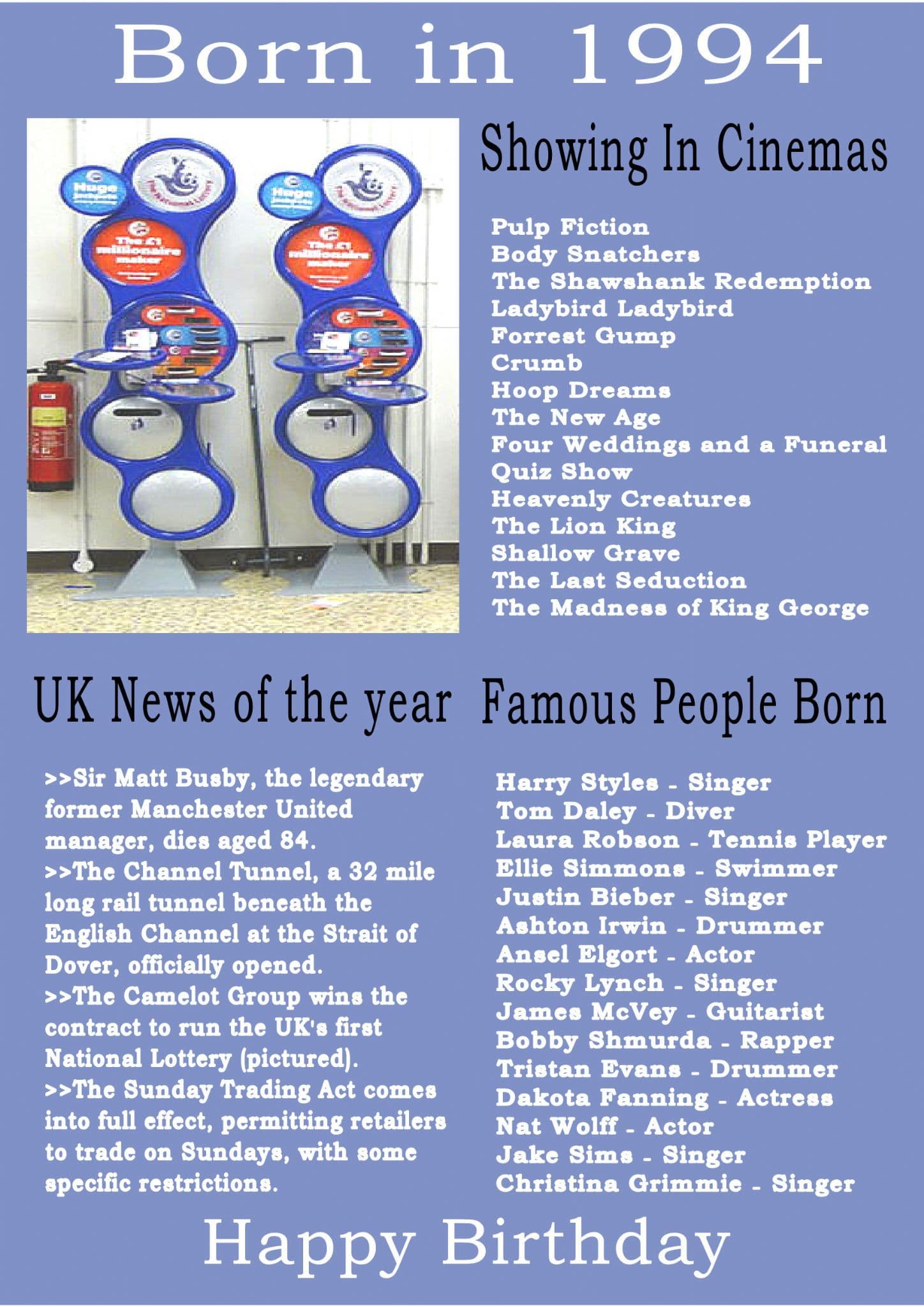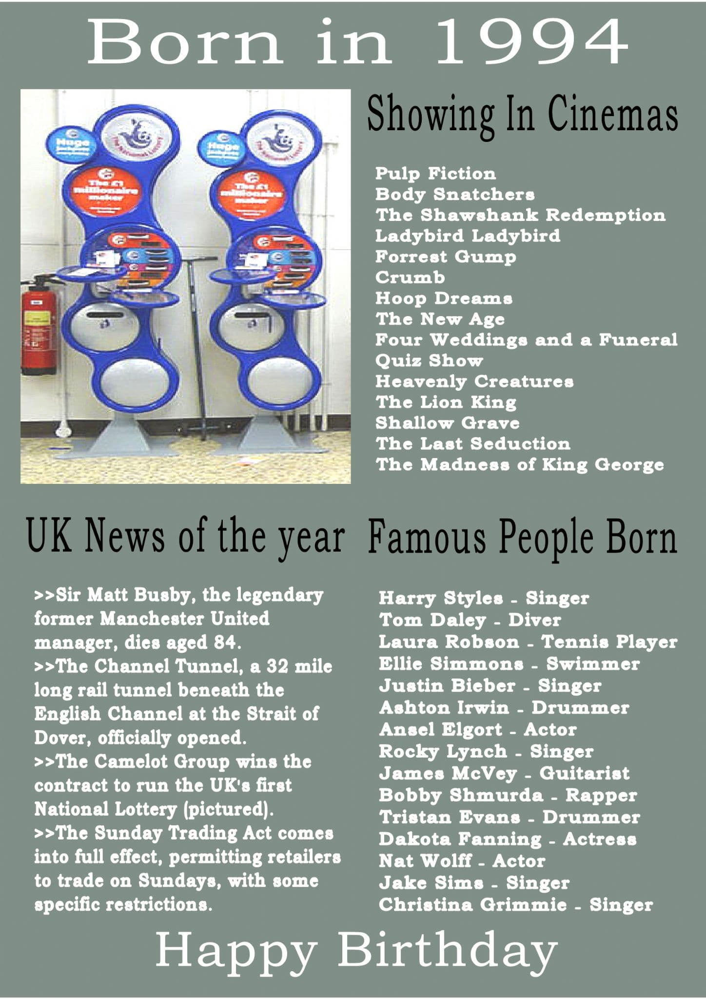 This Born In The Year 1994 card gives the recipient the UK news of the year, what was showing in cinemas that year and a list of famous people born in the year.