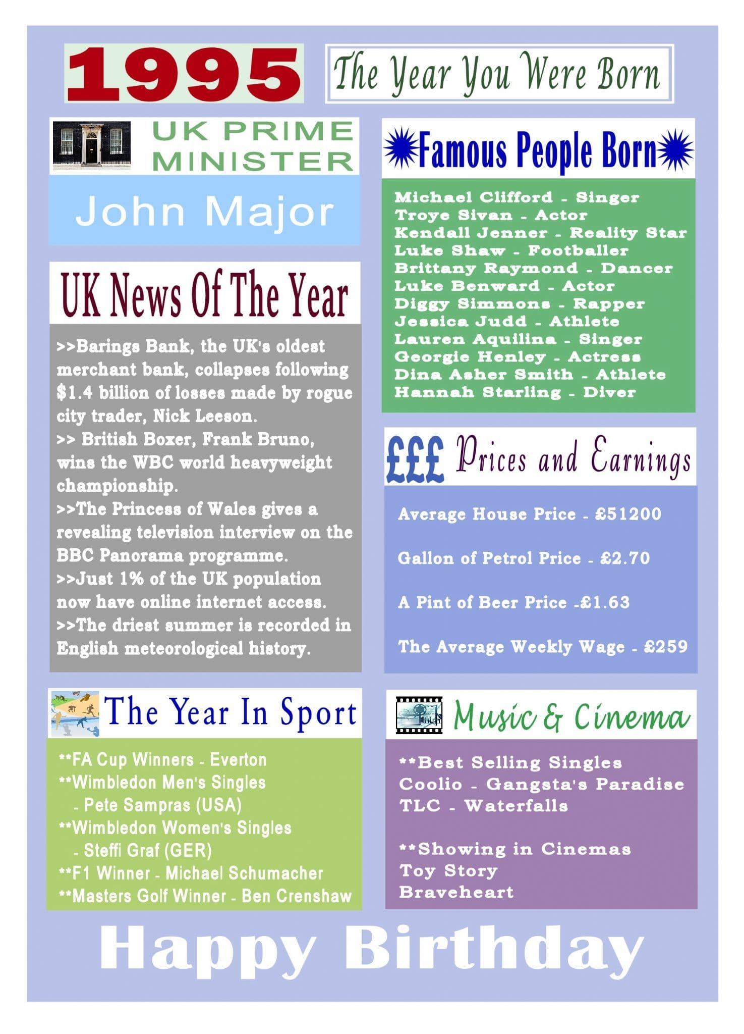 This Born In The Year 1995 card gives the recipient numerous facts about the year they were born. It shows the UK news of the year, showing in cinemas, hit singles, the Prime Minister, sporting events, prices and earnings and a list of famous people born in the year.