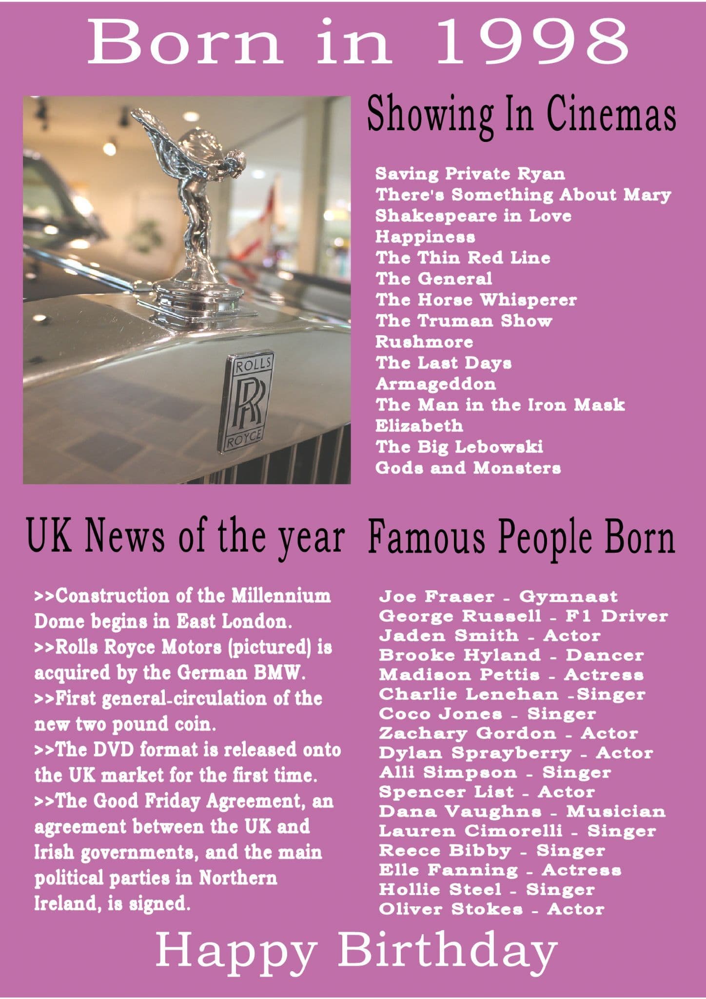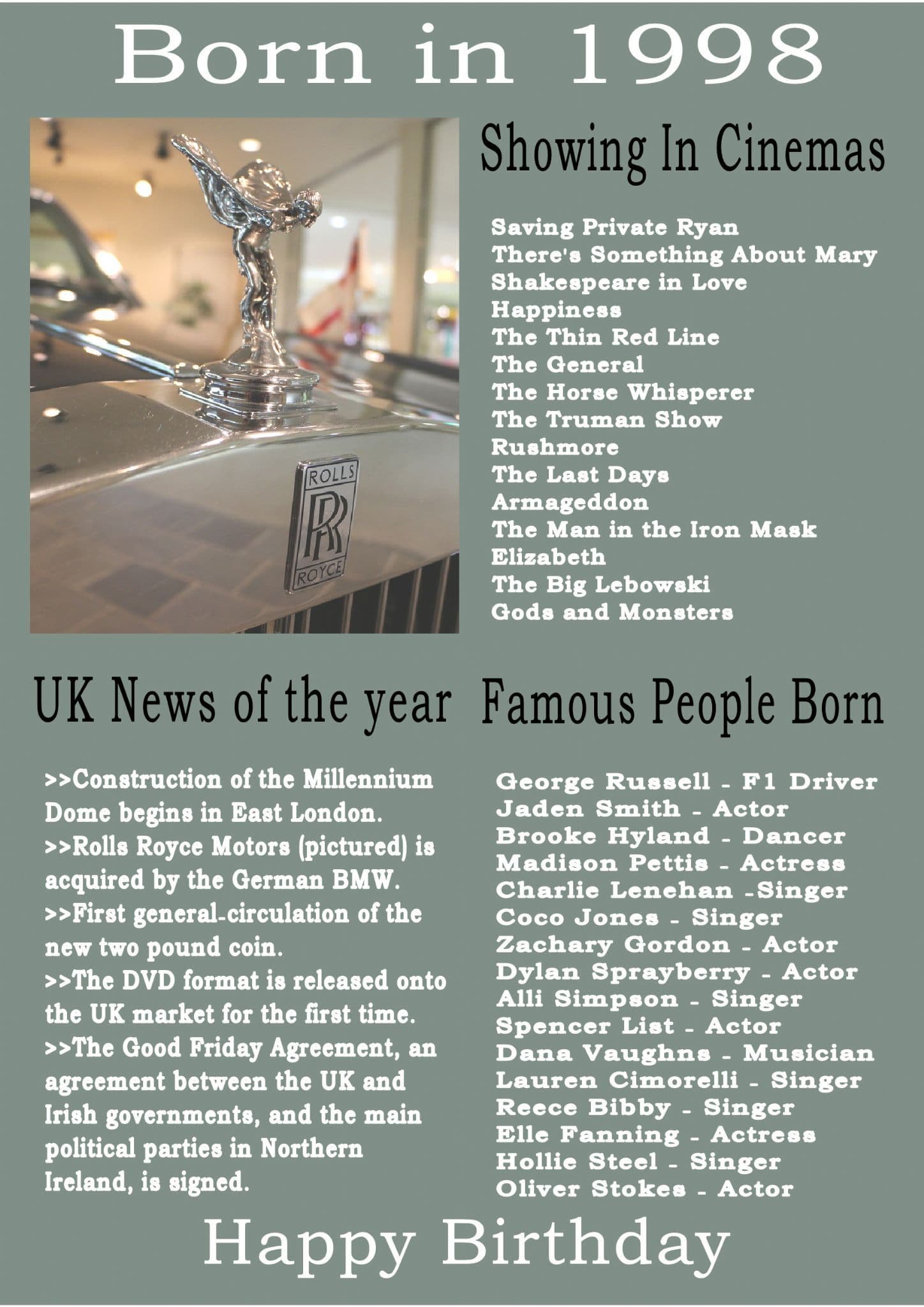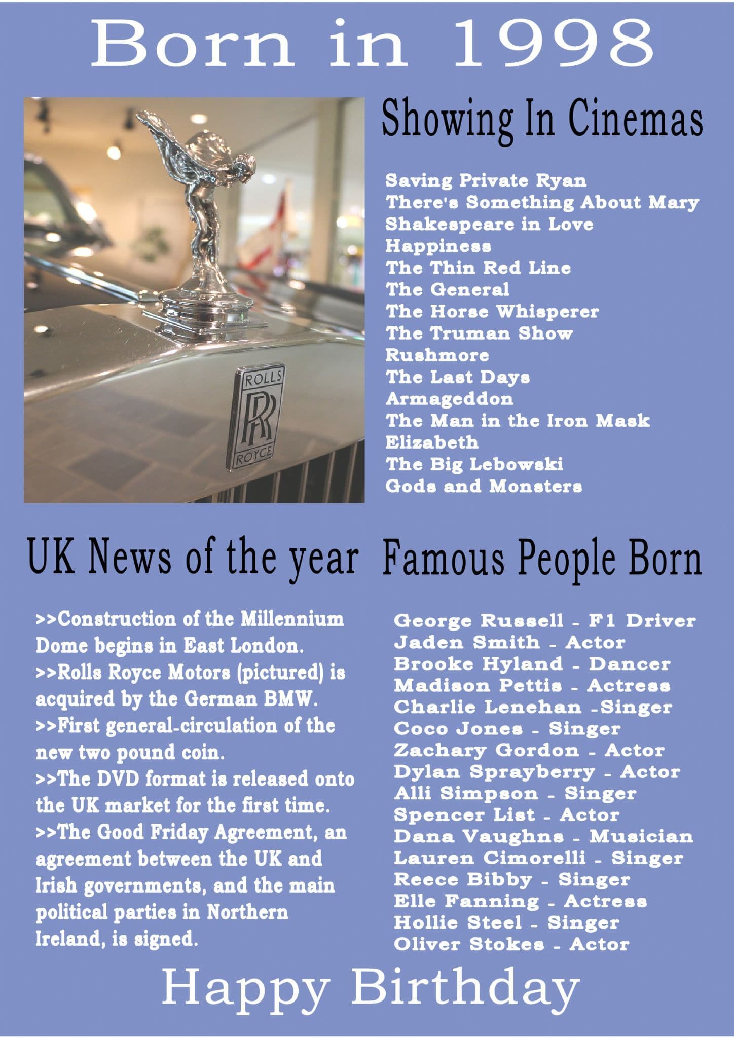This Born In The Year 1998 card gives the recipient the UK news of the year, what was showing in cinemas that year and a list of famous people born in the year.