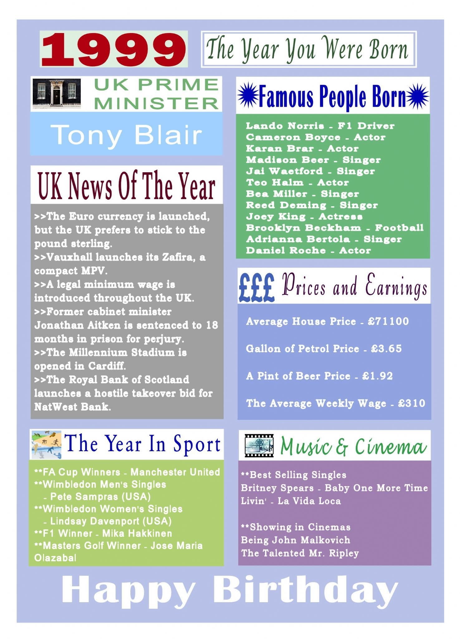 This Born In The Year 1999 card gives the recipient numerous facts about the year they were born. It shows the UK news of the year, showing in cinemas, hit singles, the Prime Minister, sporting events, prices and earnings and a list of famous people born in the year.
