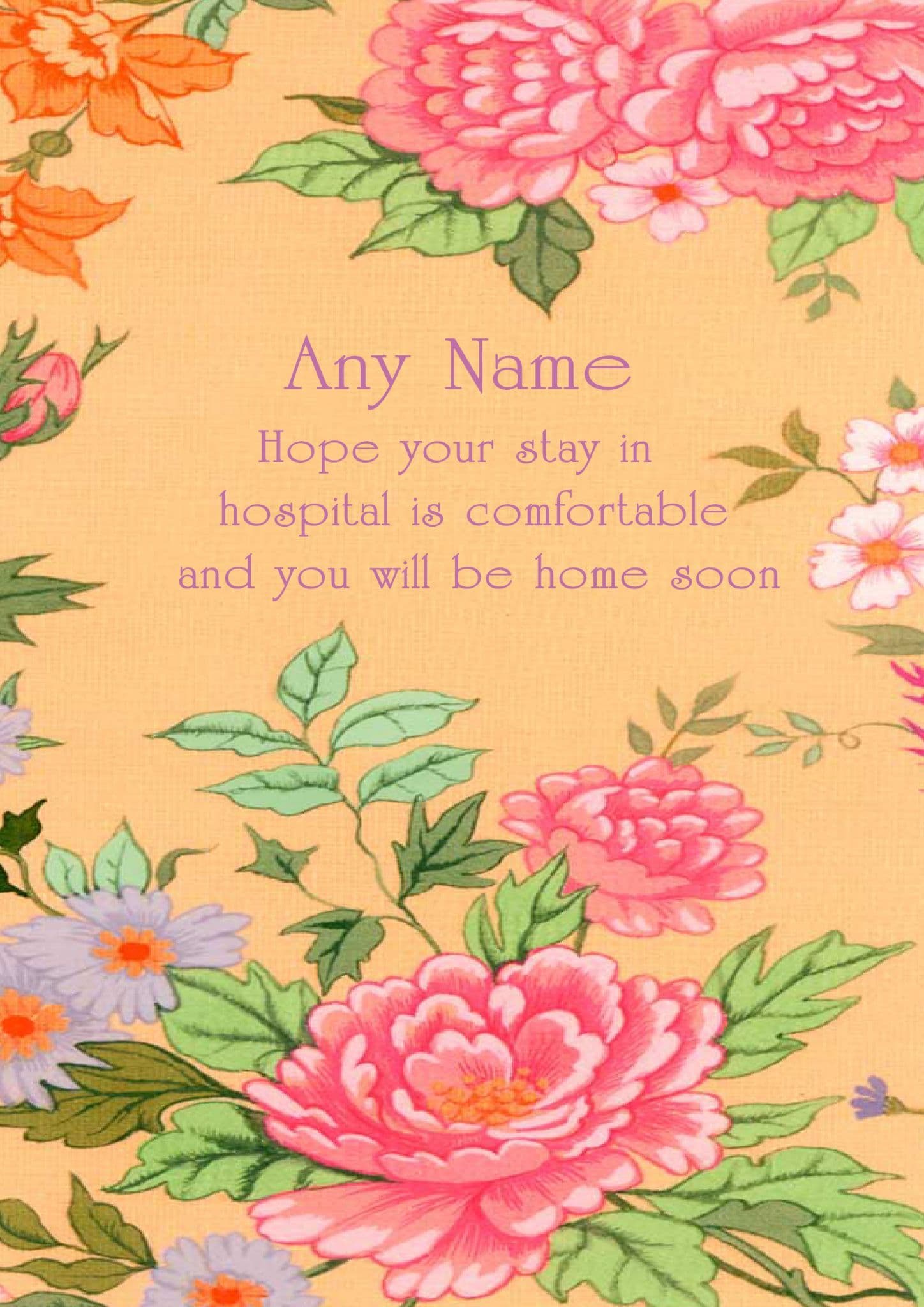 The message on the front of the card says "Hope your stay in hospital is comfortable and you will be home soon" and the inside of the card says "There's a world of joy and sunshine just around the bend when your hospital stay is over and you're back home again!" "Hope It's Soon!"