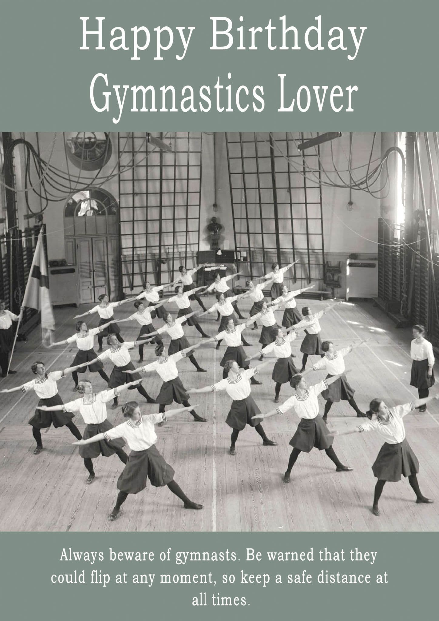 This Gymnastics sport card has the text "Happy Birthday Gymnastics Lover" on the front along with "Always beware of gymnasts. Be warned that they could flip at any moment, so keep a safe distance at all times."