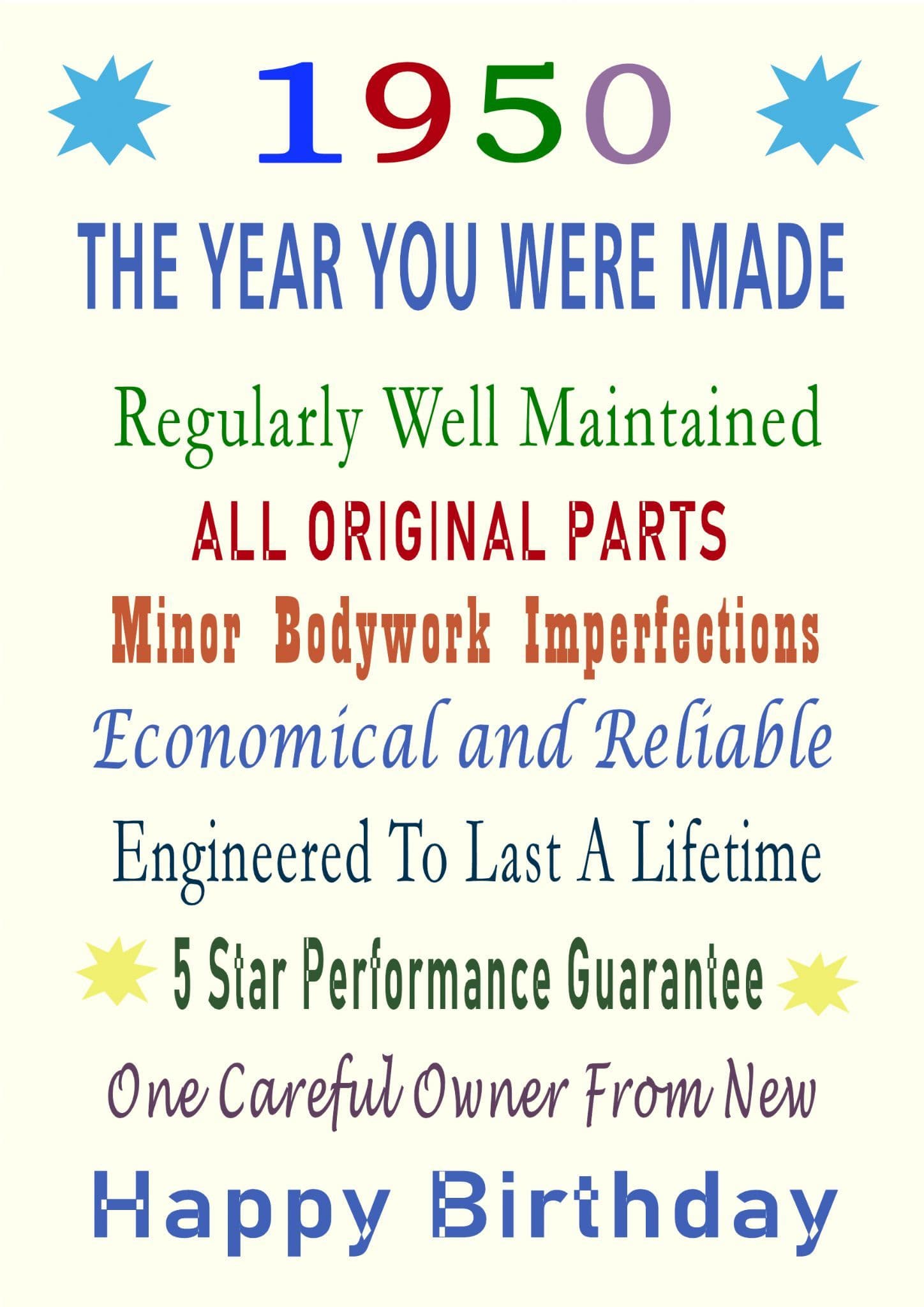 This birthday card is a take on a vehicle advertisement. It has words like "One careful owner from new", "All original parts", "Engineered to last a lifetime", Etc. Scroll over the image to see all the words. You can enter a Name of your choice in the box provided so that the card reads " Happy Birthday 'Name' ".