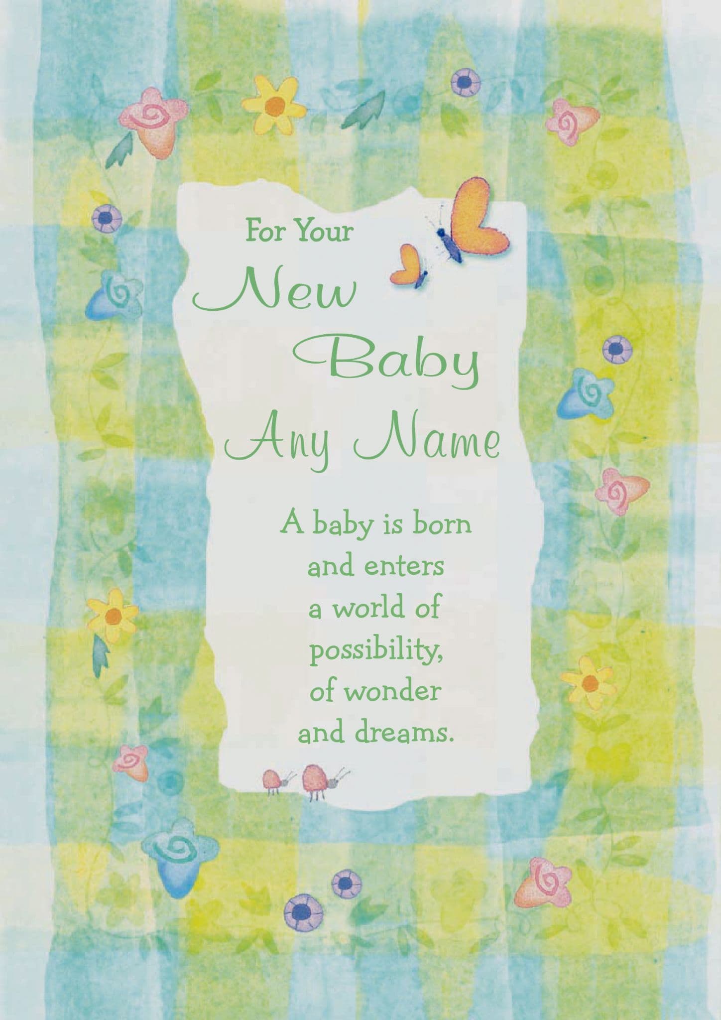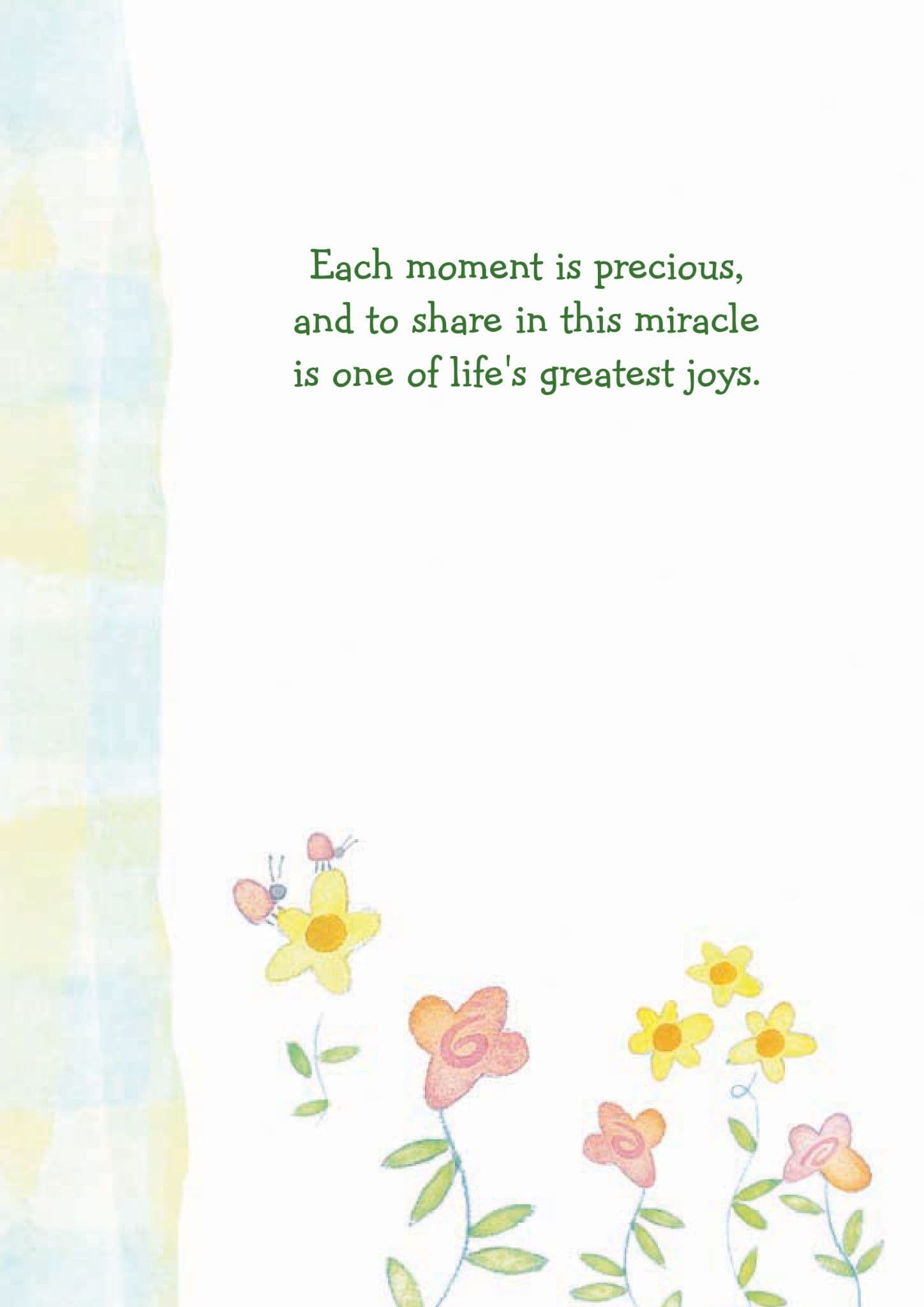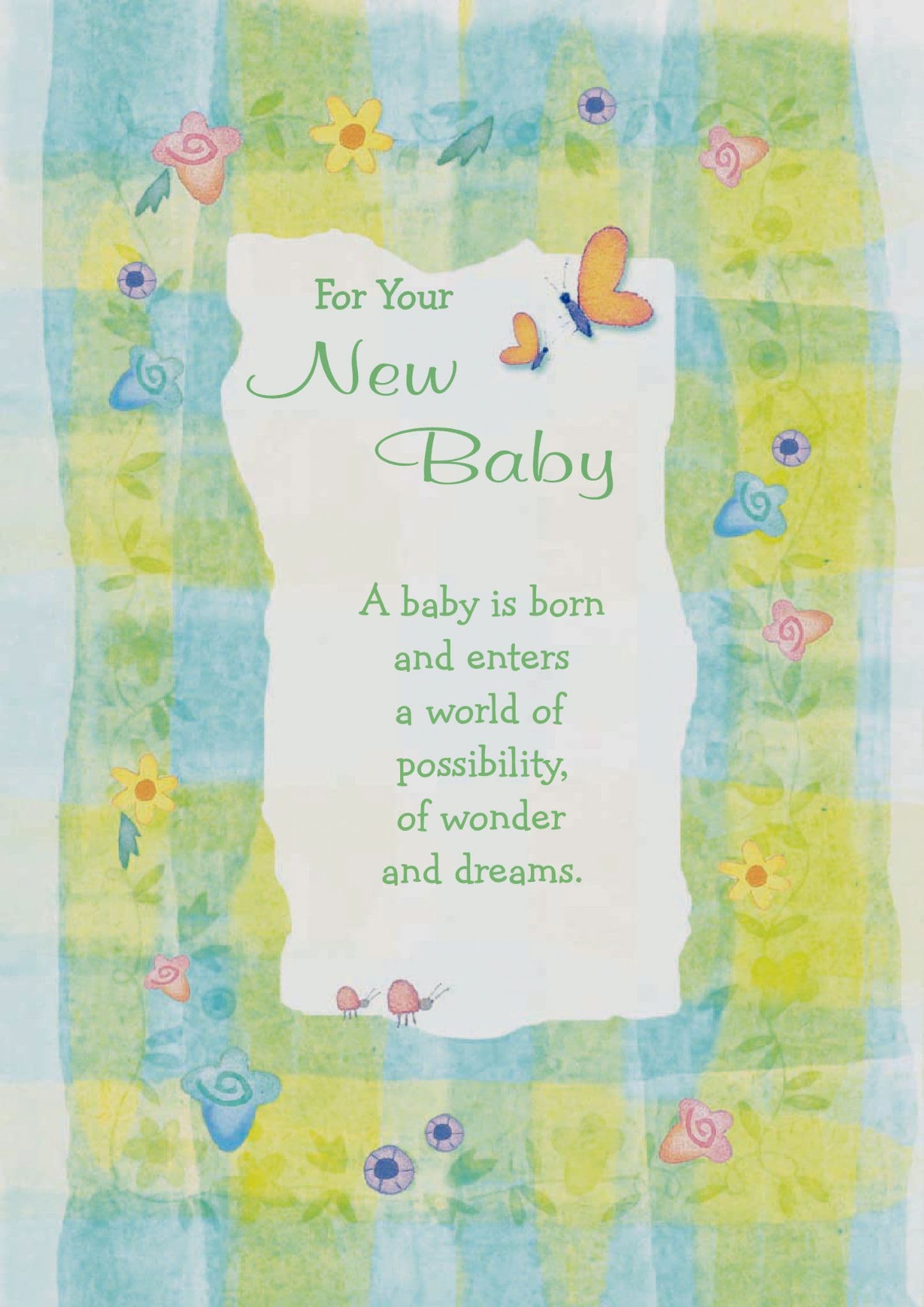 The message on the front of the card says "For Your New Baby" "A baby is born and enters a world of possibility, of wonder and dreams." and the inside of the card says "Each moment is precious, and to share in this miracle is one of life's greatest joy" "May you cherish each new day with this beautiful gift - your dear little child"