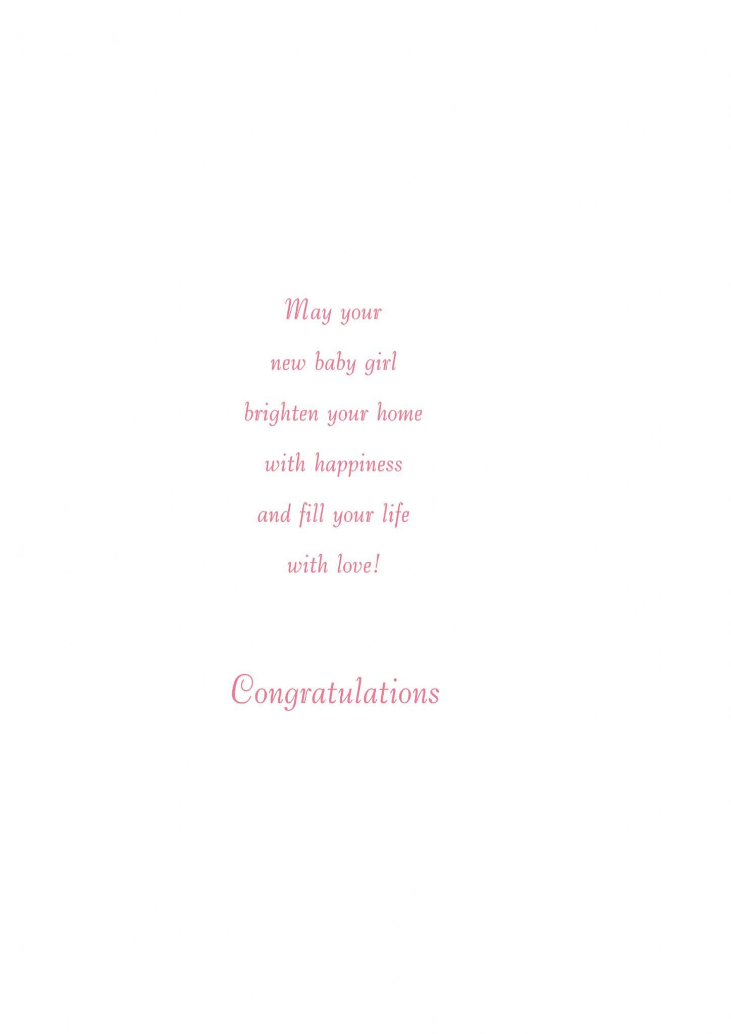 The message on the front of the card says "You Have a New Daughter!" and the inside of the card says "May your new baby girl brighten your home with happiness and fill your life with love!" "Congratulations"
