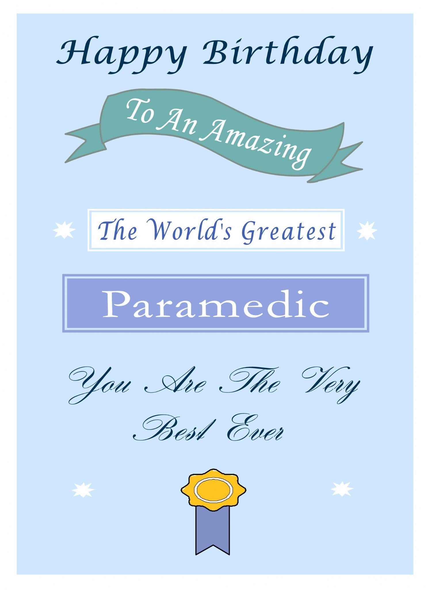 This "Occupation" birthday card has the text "Happy Birthday" "To An Amazing, The World's Greatest, Paramedic" on the front of the card and the message on the inside of the card says "Happy Birthday". The front of the card also says "You Are The Very Best Ever"