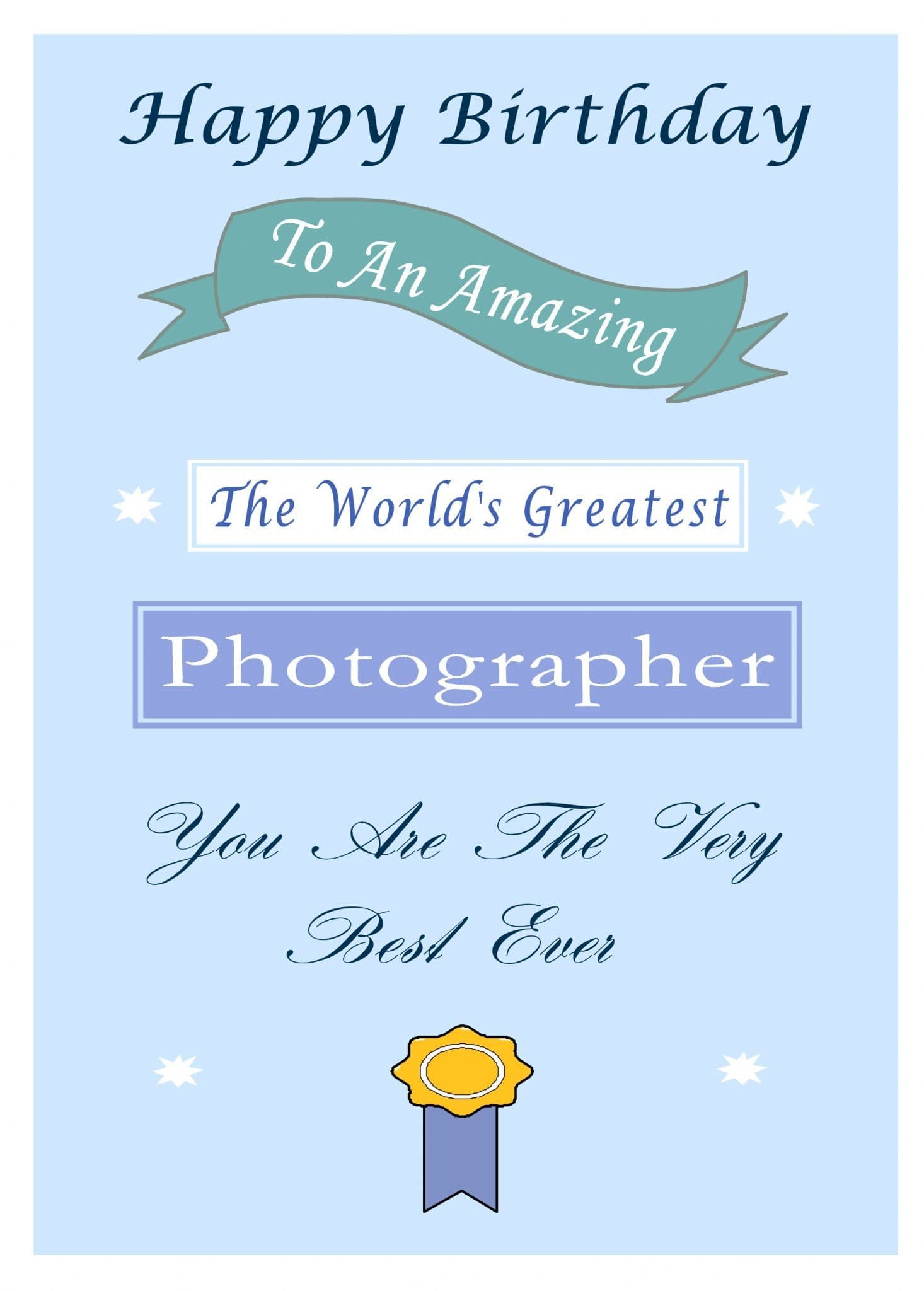 This "Occupation" birthday card has the text "Happy Birthday" "To An Amazing, The World's Greatest, Photographer" on the front of the card and the message on the inside of the card says "Happy Birthday". The front of the card also says "You Are The Very Best Ever"