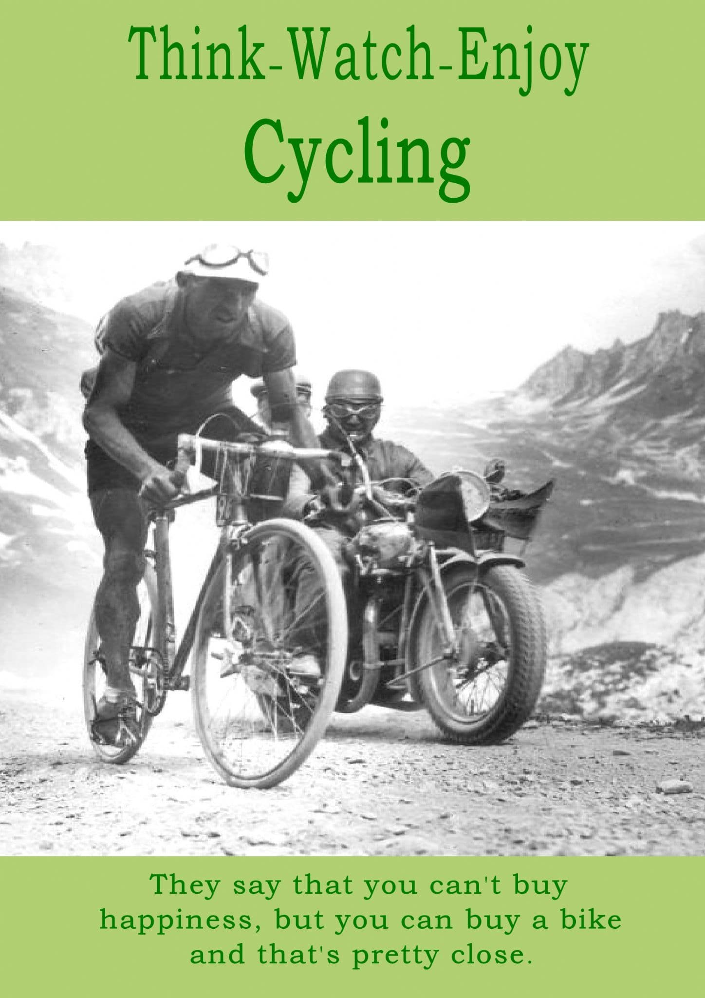 This Cycling sport card has the text "Think - Watch - Enjoy Cycling" on the front along with "They say that you can't buy happiness, but you can buy a bike and that's pretty close."