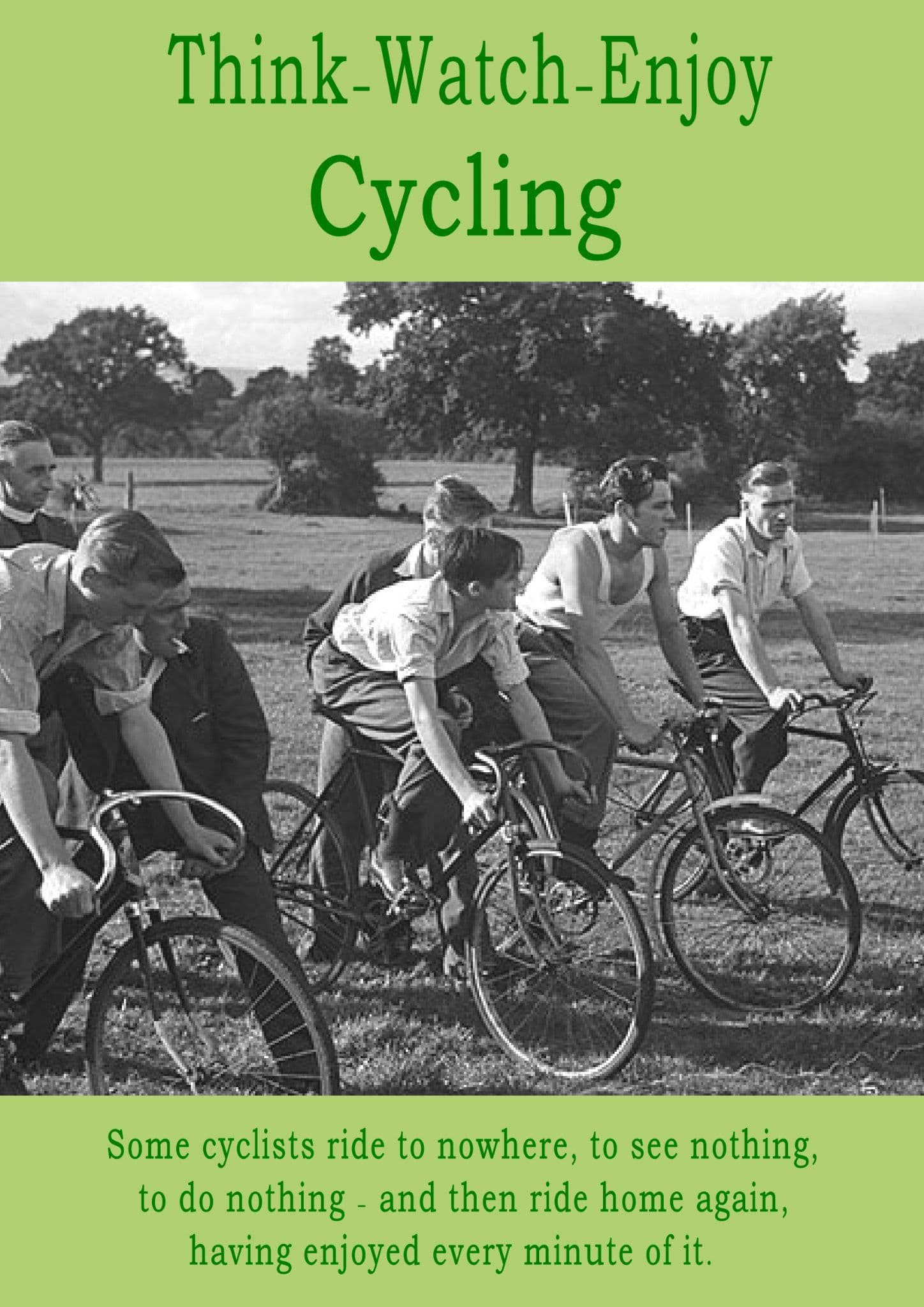 This Cycling sport card has the text "Think - Watch - Enjoy Cycling" on the front along with "Some cyclists ride to nowhere, to see nothing, to do nothing - and then ride home again, having enjoyed every minute of it."