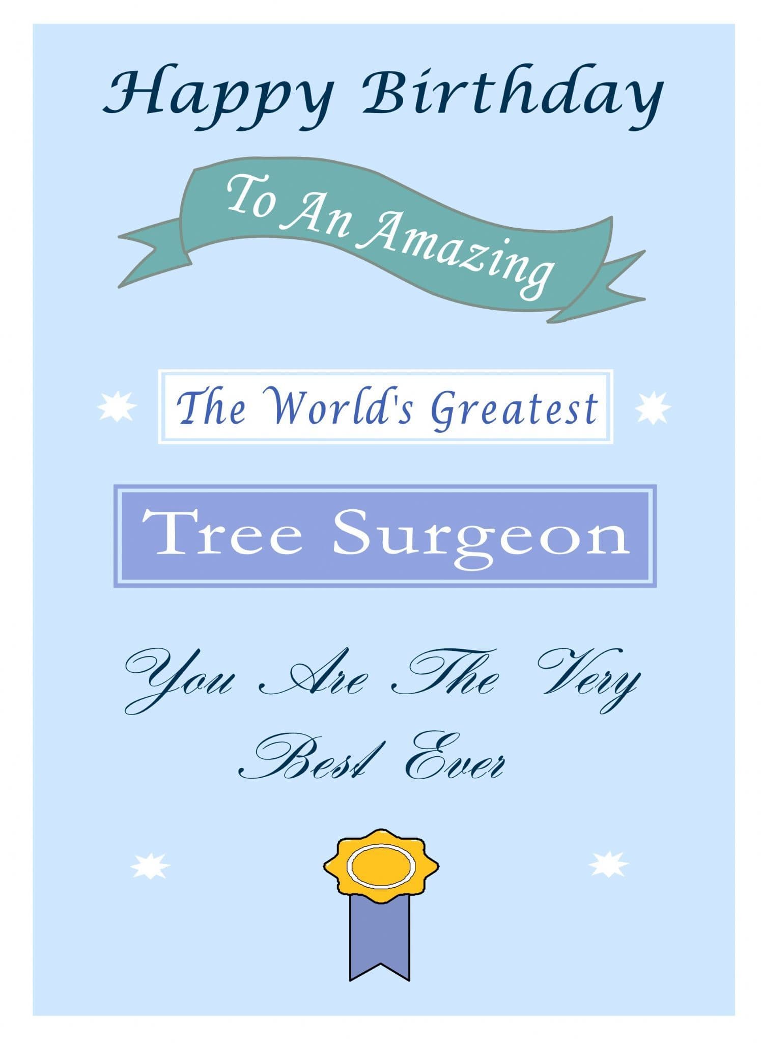 This "Occupation" birthday card has the text "Happy Birthday" "To An Amazing, The World's Greatest, Tree Surgeon" on the front of the card and the message on the inside of the card says "Happy Birthday". The front of the card also says "You Are The Very Best Ever"